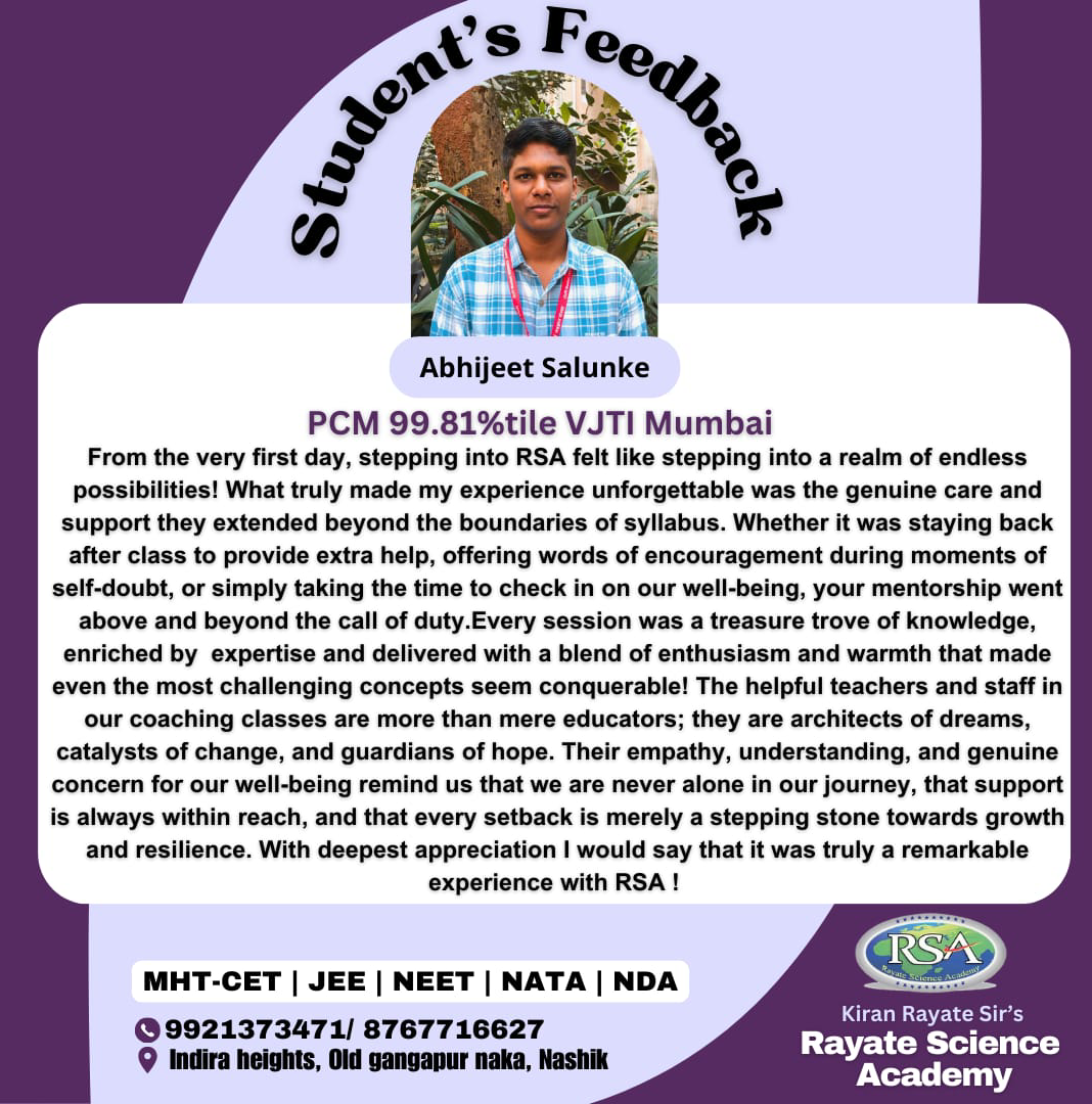 Thank you so much Abhijeet , we are happy to be able to play a part in your success journey 💯🥳🤗❤️ We Wish You All the very Best for Your Future💯👏 #topper #sincere #feedback #studentfeedback #studentssuccess #mhtcet2023 #vjti #mhtcetresult #scienceaspirants #scienceacademy #scienceclasses #rayatescienceacademy #proudofyou #rsa #prideofrsa
