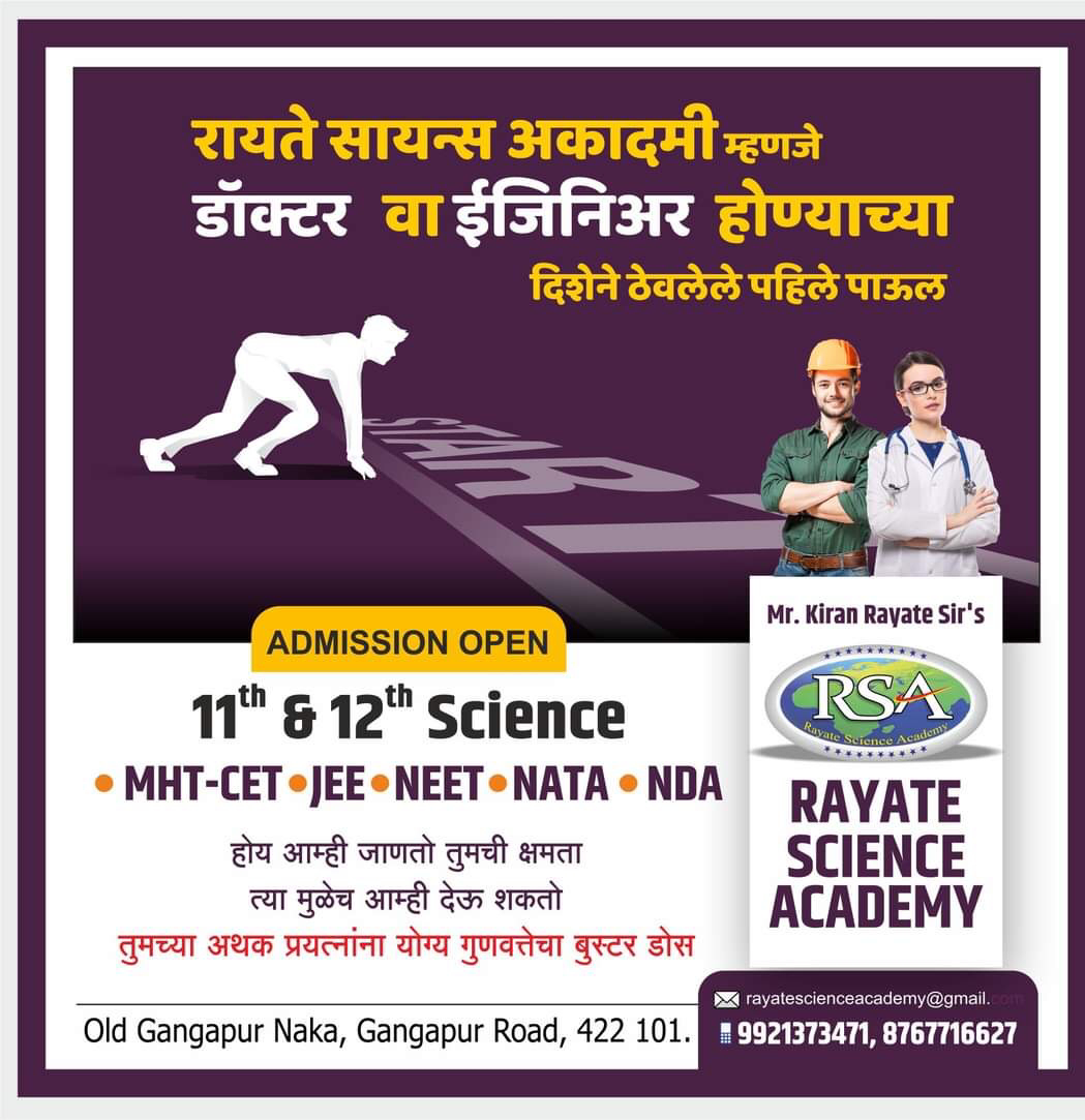 THE FIRST STEP TOWARD BECOMING A DOCTOR OR AN ENGINEER For students from Nashik who are dreaming of their bright future in Engineering and Medical and working hard to make them true Prof. Rayate science academy of Kiran Rayate sir ... This is the best option available..... Starting our new batches of limited number of students. Contact us immediately for further preparations. +91 99213 73471 Prof. Kiran Rayate Sir's well known Nashik Based Best Mentor-ship & coaching institute of 11th & 12th Science, FOUNDATION, CRASH COURSE, MHT-CET / JEE / NEET/ NATA / NDA